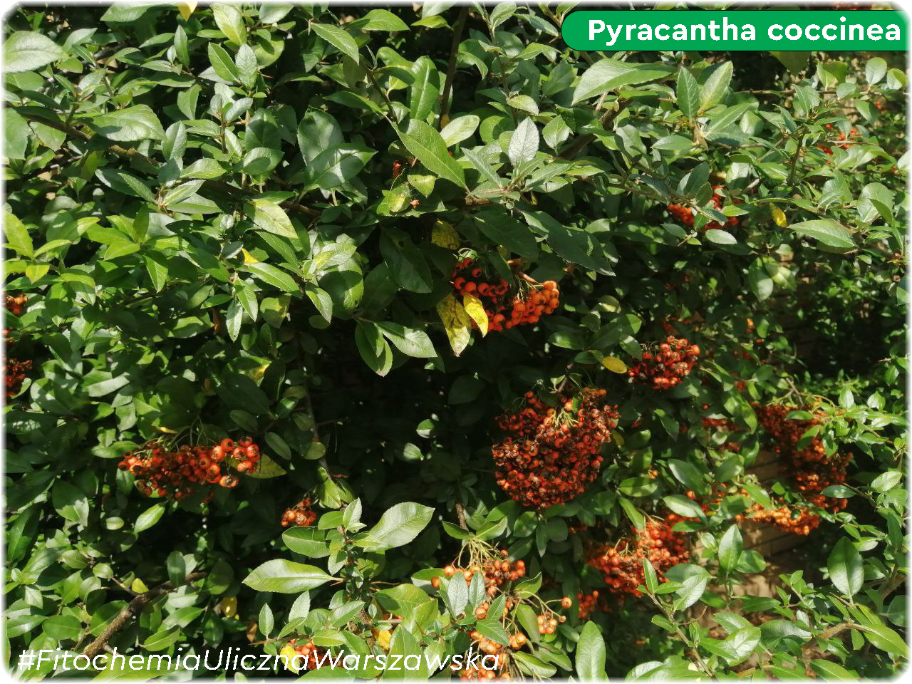 Честь открыть серию предстоит представителю семейства Розовые. Кустарнику, который должен был бы находится в Юго-Восточной Азии, в крайнем случае на юге Европы, Крыму или Сочи но. Но каким-то чудом очень часто встречается в варшавских парках и на аллеях. Это Pyracantha coccinea (Пираканта ярко-красная).