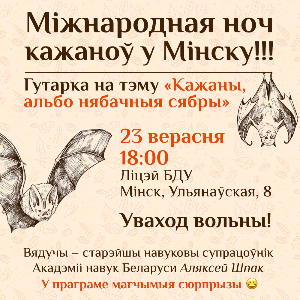 Каждый сентябрь Алексей организовывает традиционную "Международную ночь летучих мышей". В этом году мероприятие запланировано на вечер 23 сентября и пройдет в Лицее БГУ (ул. Ульяновская, 8). Если так оказалось, что вы все еще в Минске, то обязательно посетите, не так много таких светлых мероприятий в той Беларуси осталось. И обязательно передавайте Алексею за его труд персональную благодарность от @lab66.