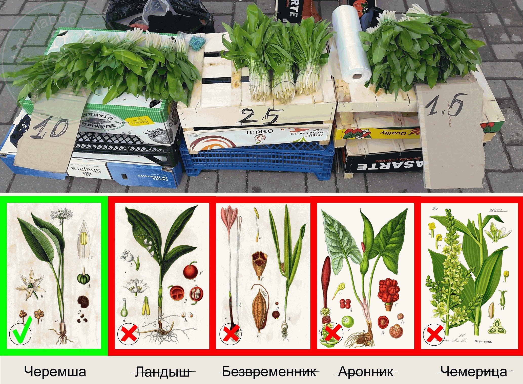 Но речь сегодня не об этом. Речь о том, что если уж вам просто невтерпеж приобрести пучок черемши с лотка, позаботьтесь о том, чтобы проверить, а действительно ли черемшу вам пытаются продать (то же самое касается и самостоятельного сбора). К мимикрирующим под дикий лук можно отнести ландыш, безвременник осенний, аронник пятнистый и чемерицу белую (