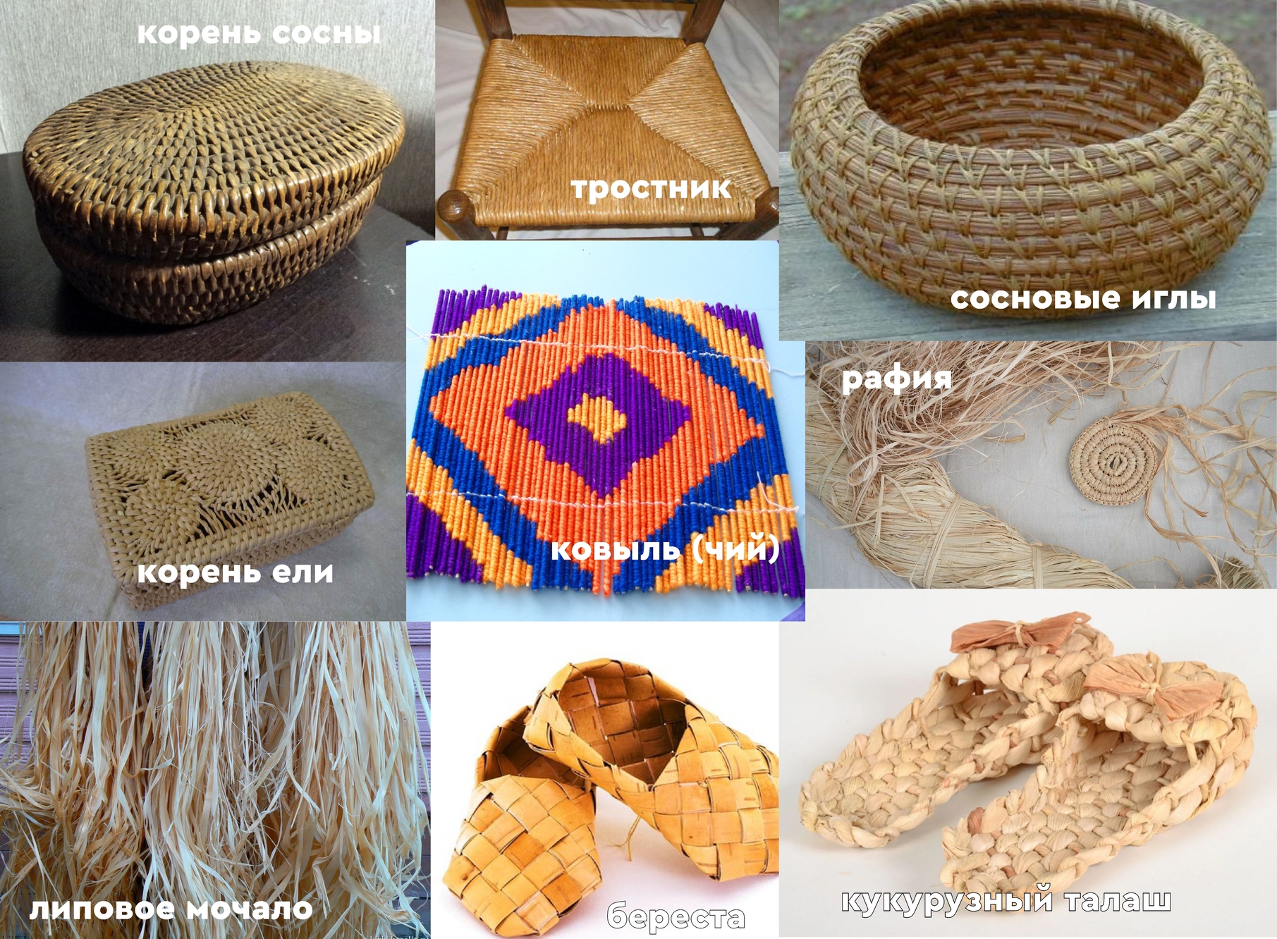 В больших масштабах материал первой категории производится из стеблей/листьев ротанга, стеблей/листьев бамбука, листьев эспарто и уже упомянутой рафии. Из второй категории - лидерами являются все те же листья эспарто и луб рафии. Все упомянутые растения на наших территориях не прижились. Отечественным "суррогатом" стеблей бамбука и ротанга является подмножество ив (ива белая/ракита/верба), лесной орех (лещина), черемуха, рябина обыкновенная. Интересным конструкционным материалом используемым в Беларуси (прим. - как минимум в Беларуси, могу гарантировать так как сам такими изделиями пользовался) являются корни сосны. Не менее интересный вариант - жгуты из вываренных сосновых игл, из которых делаются интересные корзины.