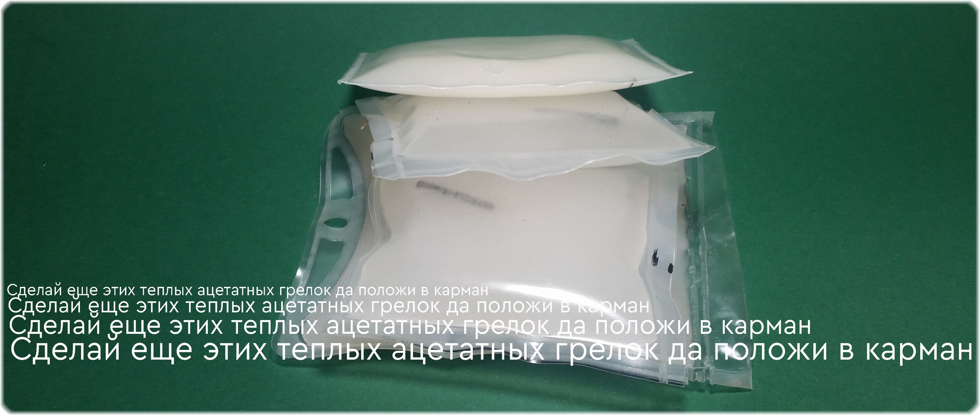 Готовый горячий насыщенный раствор можно разливать в подготовленные пакеты (склеенные из толстых засолочных ПЭ пакетов, из канцелярских папок-уголков, из обложек для школьных учебников, можно использовать и мягкие капельницы из-под глюкозы, хлорида натрия, фурациллина). На такие простейшие грелки работают очень нестабильно, спонтанно активируются, перестают работать после нескольких запусков.