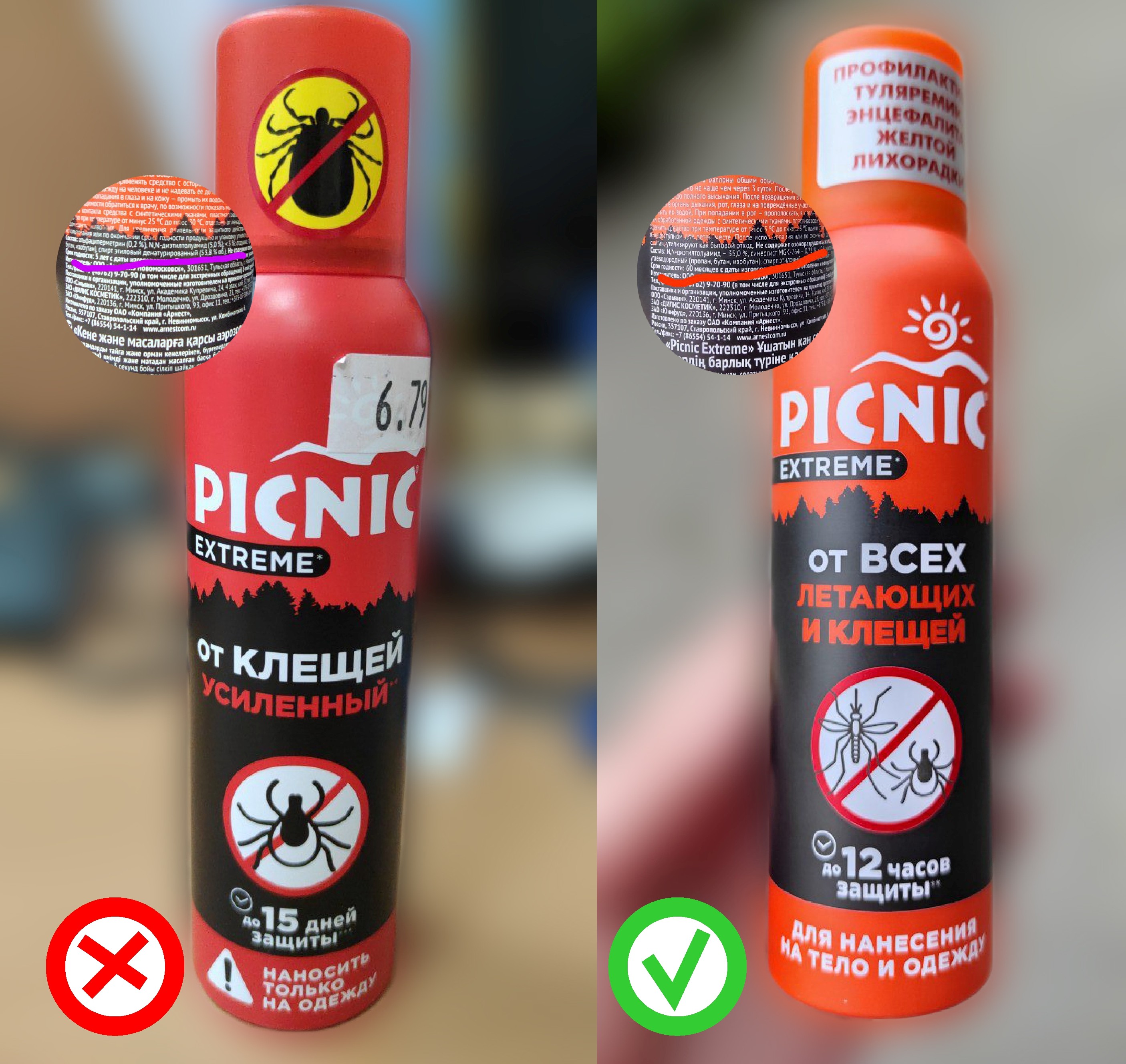 На памятку по репеллентам уже пришла первая рекламация (спасибо читателю Дмитрию М. за замечание&фотографии). Оказалось что не все средства марки PICNIC Extreme (далее РЕ) эквивалентны между собой. Вариант "от клещей усиленный" кардинально отличается по составу от варианта "от всех летающих и клещей". Дожили мы, друзья, наконец до того времени, когда название абсолютно ничего не значит.