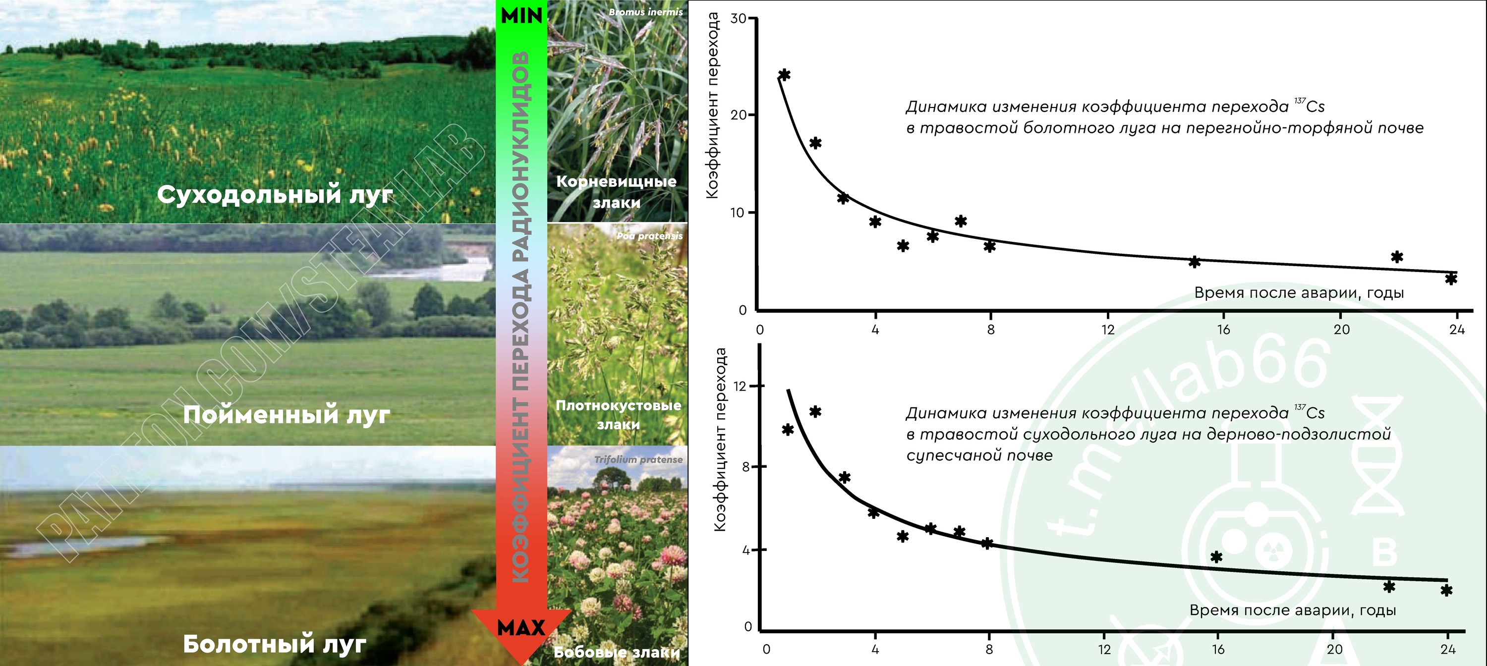 Накопление цезия-137 в траве сенокосов и пастбищ определяется типом луга, почвенными характеристиками, видовым составом травостоя. В целом можно считать что загрязненность одной и той же территории будет снижаться в ряду болотные луга > пойменные/низинные луга > суходольные луга. В зависимости от типов лугов, коэффициенты перехода (КП) цезия-137 будут варьироваться от в дипазон 0,5-30 (Бк/кг)/(кБк/м²). Насколько хорошо трава накапливает радиоактивный цезий зависит от превалирующих в покрове луга растений. Самые загрязненные - это покрытия из бобовых растений (клевер луговой, люпин, вика, люцерна, донник etc). Гораздо меньшие коэффициенты перехода характерны для злаковых растений.При этом плотнокустовые злаки (овсянница овечья, мятлик луговой etc) накапливают цезий в несколько раз лучше чем злаки корневищные (пырей ползучий, кострец безостый etc).