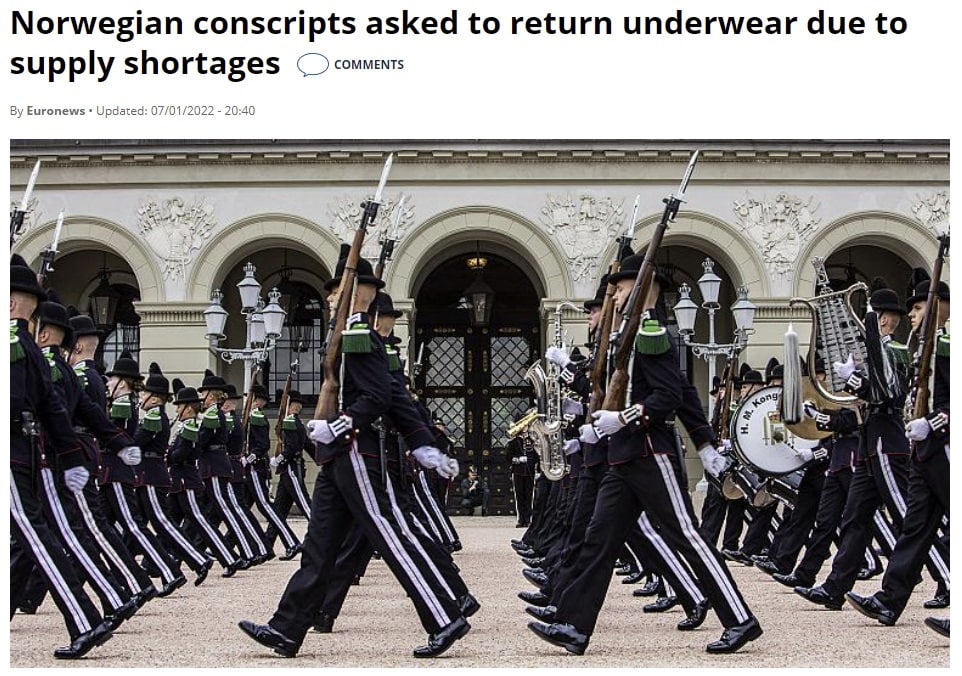 Норвежская армия испытывает проблемы с запасами нижнего белья для своих призывников, которым теперь придется возвращать государству после службы носки и бюстгальтеры (8000 парней и девушек ежегодно проходят полуобязательную службу на границе с Россией, охраняя северные рубежи НАТО). Это связано с пандемией коронавирусной инфекции, которая нарушила логистику поставок нижнего белья в армию. До прошлого года новоиспеченные солдаты Норвегии получали новое белье.