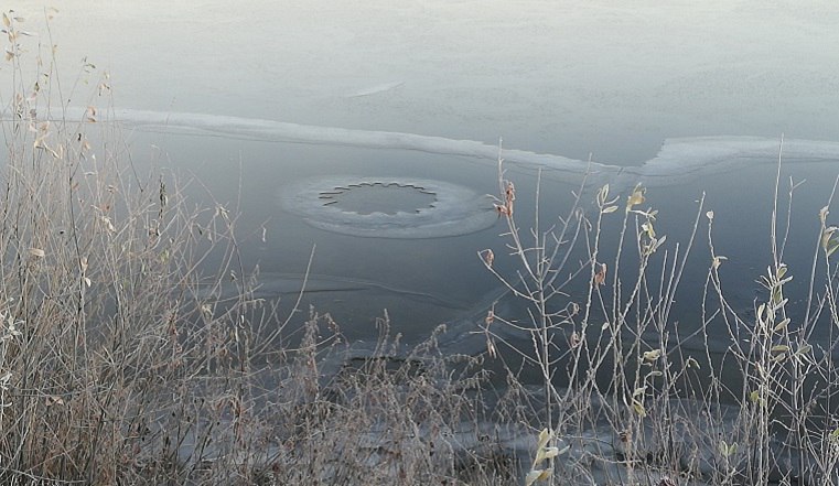 Дыра во льду кому-то напомнила цветок, другим - шестеренку. Озерчане спорят о причине появления странной фигуры. Среди выдвинутых версий - выход на поверхность газа, подводный источник, бьющий под полыньей, выброшенный в озеро предмет, придавший форму льду. Есть, конечно же, версия о тайном послании инопланетного разума.