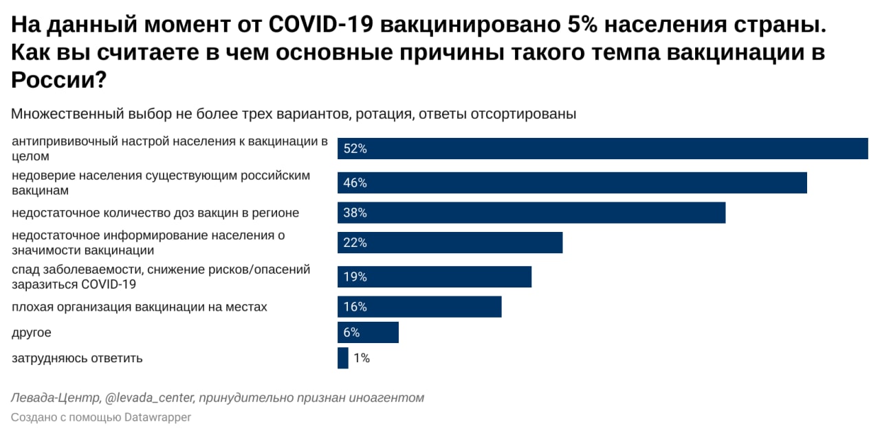 Для того, чтобы подробнее разобраться в том, как видят ход вакцинации внутри медицинского сообщества, Левада-Центр и «Врачи РФ» провели опрос врачей.