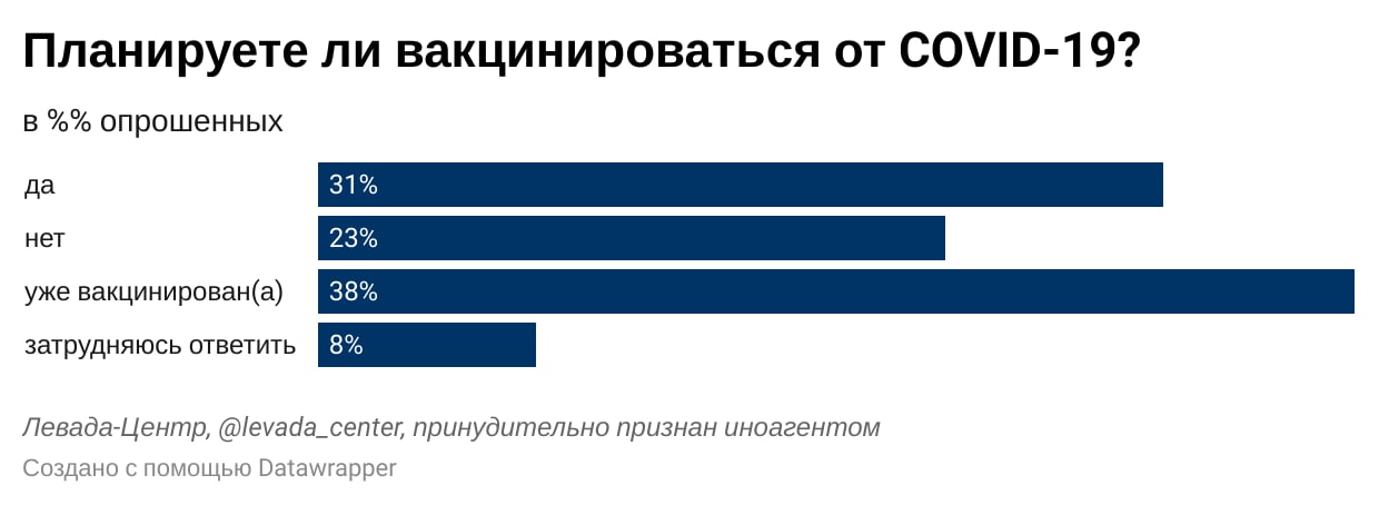 Среди опрошенных врачей преобладают позитивные намерения относительно вакцинации от COVID-19: 4 из 10 участников опроса уже привились от COVID-19; 3 из 10 – планируют поставить вакцину в будущем. Около четверти опрошенных пока не готовы вакцинироваться. Эти цифры значительно отличаются от мнения населения: по данным февральского опроса не готовы вакцинироваться 62% россиян.