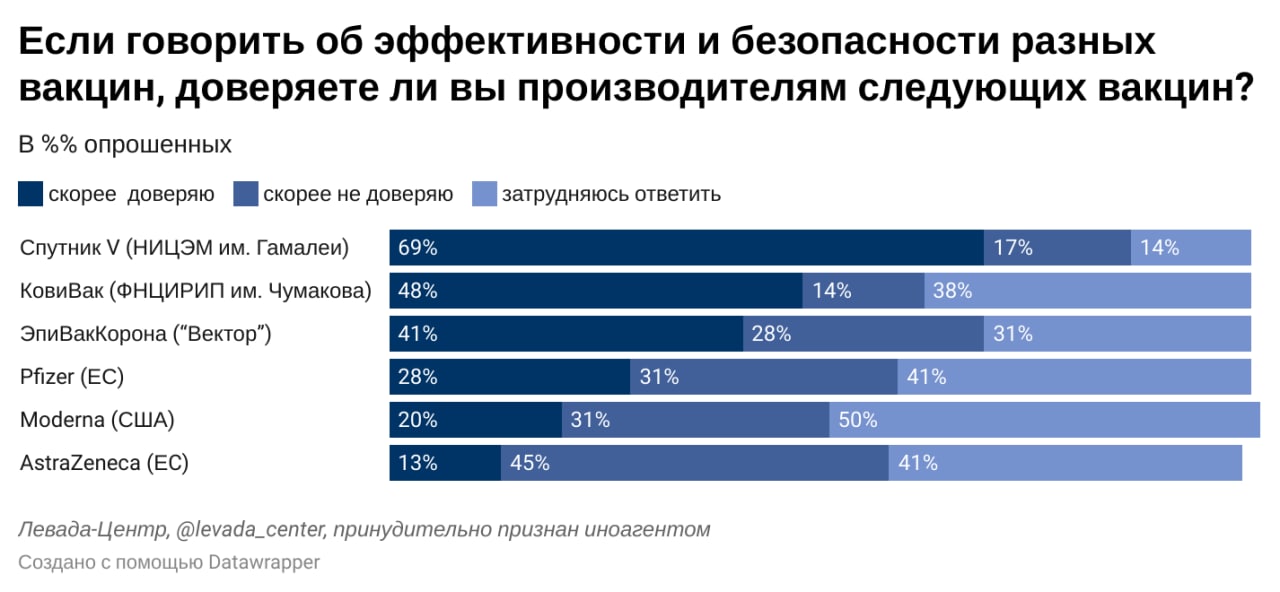 Среди российских вакцин наибольшим доверием медицинских специалистов обладает вакцина Спутник V – в ее эффективности и безопасности уверены почти 70% опрошенных врачей. Две другие отечественные разработки пока остаются менее знакомыми специалистам, им доверяют менее половины опрошенных. Более настороженно врачи относятся к вакцине ЭпиВакКорона - ей выразили недоверие 28% опрошенных. При этом более трети участников опроса затруднились дать оценку их качеству двум последним вакцинам от COVID-19.