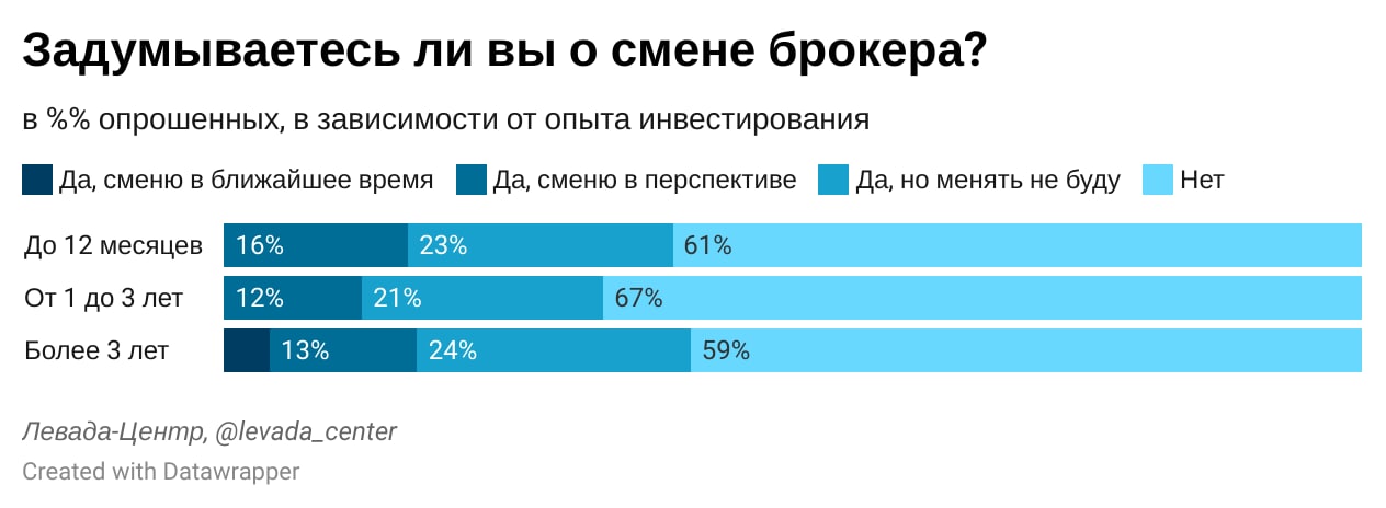 Инвесторы чаще всего выбирают брокеров, ориентируясь на широту выбора инструментов, удобство полонения счёта и легкость старта работы. В работе брокеров инвесторы чаще всего жалуются на нехватку доступа к зарубежным бумагам и биржам. В целом у инвесторов высокое доверие к финансовым компаниям, с которыми они работают. Чем больше возраст инвесторов, тем больше доверие финансовым компаниям.