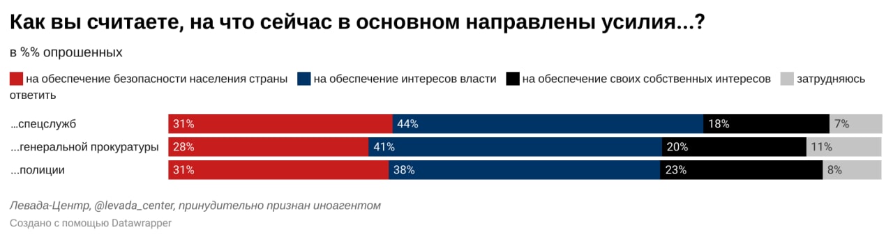 Больше половины россиян считают, что находящиеся у власти люди озабочены лишь собственным благополучием. Эта точка зрения преобладает во всех возрастных группах респондентов. В наибольшей степени в этом убеждены избиратели КПРФ (78%), в минимальной степени такое отношение к власти характерно для сторонников ЕР (26%). Среди последних, напротив, преобладает мнение, что «это хорошая команда политиков, которая ведёт страну правильным курсом» (39%). Комментарий Льва Гудкова.