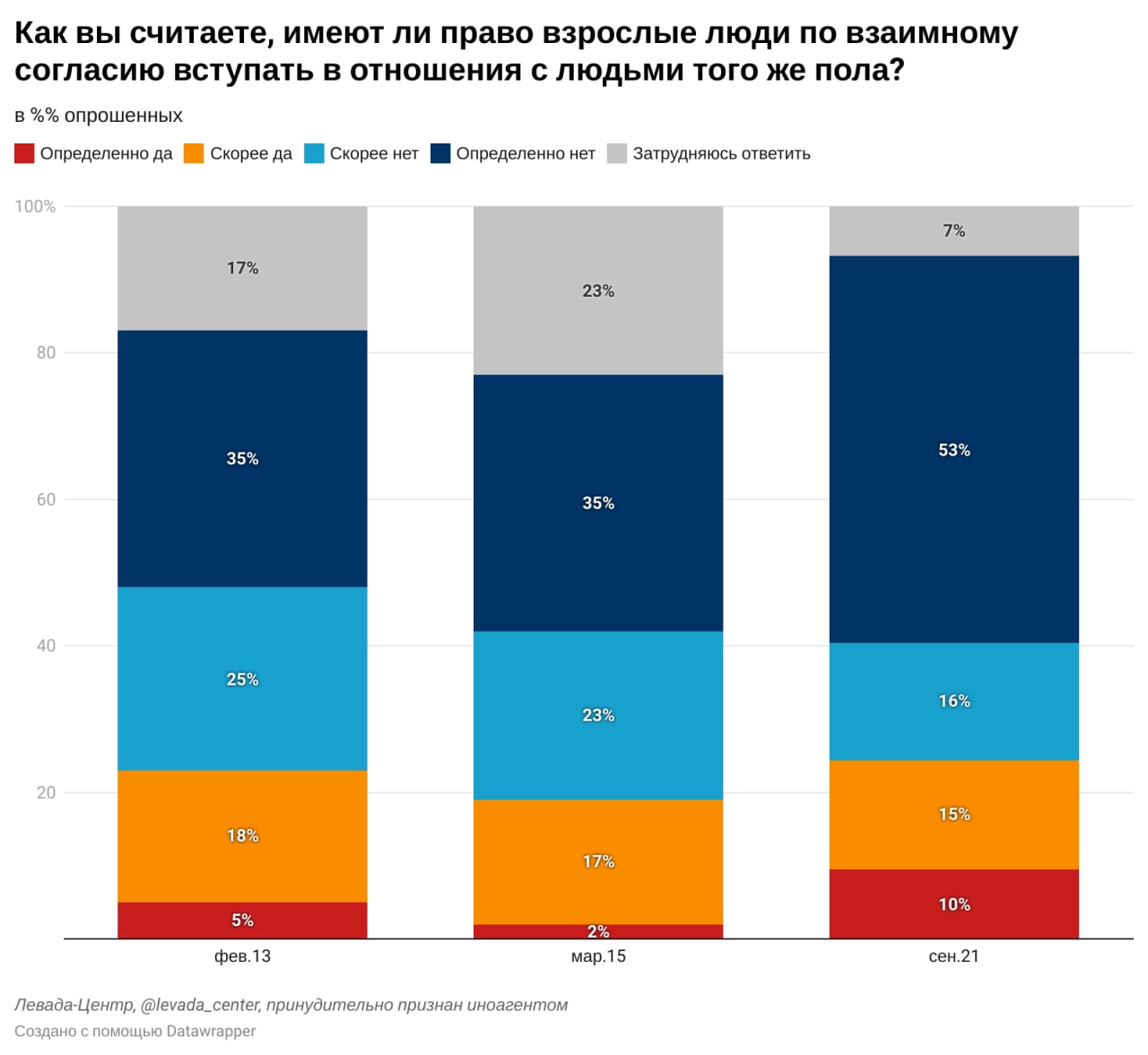 Четверть россиян считают, что взрослые люди имеют право на однополые отношения, две трети считают обратное. В том, что люди имеют право на однополые отношения, чаще всего уверены молодые люди и те, у кого есть знакомые гомосексуальной ориентации. Треть россиян считают, что ЛГБТ люди должны иметь равные права с остальными гражданами, 59% — что не должны. В отношении людей гомосексуальной ориентации общественное мнение становится более поляризованным.