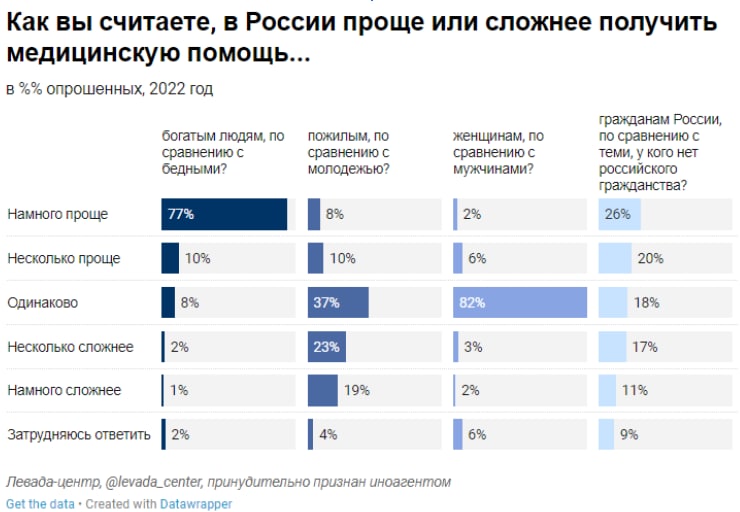Большинство россиян говорят о неравенстве доступа к медицинской помощи из-за их экономического положения или возраста. 87% считают, что богатым людям проще по сравнению с бедными получить медицинскую помощь; 42% говорят, что пожилым получить лечение труднее, чем молодым. Четверть россиян (27%) выступают за то, что государство должно гарантировать лишь набор основных медицинских услуг, 61% опрошенных считают, что государство должно обеспечивать полный спектр необходимых медуслуг. При этом 70% не готовы платить более высокие налоги для улучшения медицинского обслуживания для всего населения России.