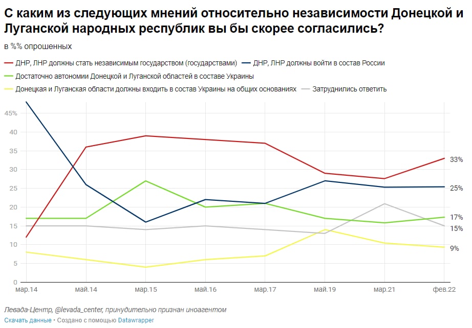 На фоне эскалации вокруг Донбасса выросла доля тех, кто плохо относится к Украине: если в ноябре прошлого года плохо к Украине относились 43% респондентов, то в феврале этого года - 52%. 60% опрошенных считают США и страны НАТО инициаторами обострения на востоке Украине. До официального решения о статусе народных республик 33% респондентов полагали, что ДНР и ЛНР должны стать независимыми государствами, 25% считали, что они должны войти в состав России, 26% - что они должны оставаться в составе Украины. Опрос проводился с 17 по 21 февраля.