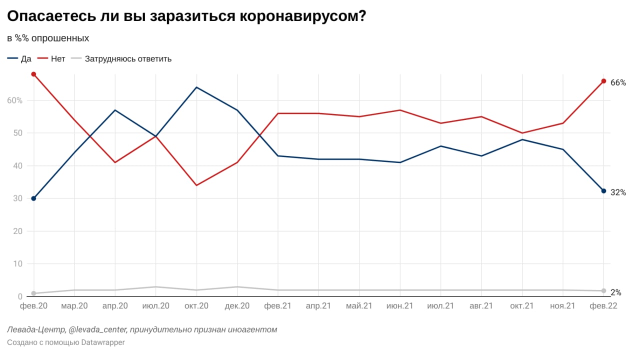 С ноября 2021 года по февраль 2022 года заметно выросла доля тех, кто не опасается заразиться коронавирусом, - таких 66%. Количество россиян, сделавших прививку, продолжает расти и в феврале достигло половины населения страны. Больше трети тех, кто делал прививку, прошли ревакцинацию. Половину россиян беспокоит возможность заразиться самим или заразить других через прикосновения и поцелуи; 45% россиян стараются ограничивать физические контакты с другими людьми.