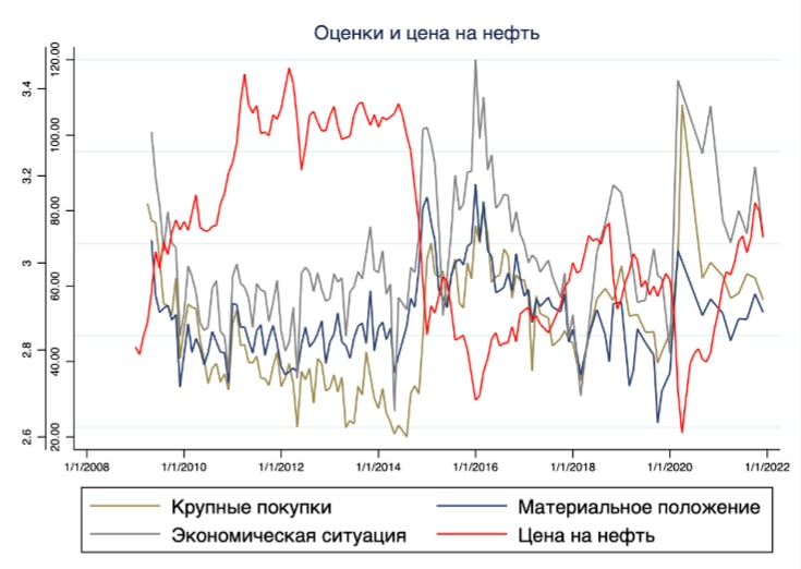 Левада-Центр представляет данные анализа взаимосвязи макроэкономических показателей — стоимость барреля нефти, обменный курс доллара, индекс потребительских цен — и данных субъективных оценок социально-экономического положения, измеряемых Левада-Центром. В данном материале показано, что макроэкономические показатели страны оказывают сильное влияние на общественное мнение о сберегательном поведении. Материал К. Сильвестрович и С. Гончарова.