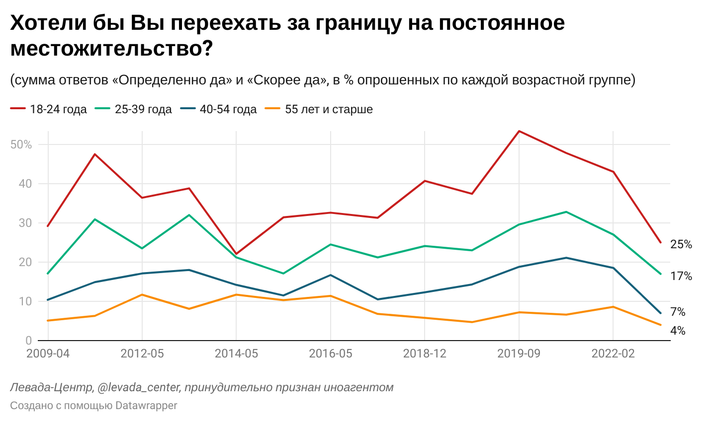 Каждый десятый россиян хотел бы переехать за границу на постоянное местожительство. На фоне конфликта с Западом произошло снижение эмиграционных настроений, что похоже на то, как настроения развивались в 2014 году. При этом в последние годы количество тех, кто обдумывал отъезд и готовился к нему, было чуть больше, чем еще 7-8 лет назад. Чаще всего о желании уехать говорят молодые люди. Среди главных причин отъезда респонденты называют неблагоприятную экономическую и политическую обстановку внутри страны и желание обеспечить детям достойное будущее за рубежом. Опрос проводился 17-21 февраля и 24-30 марта.
