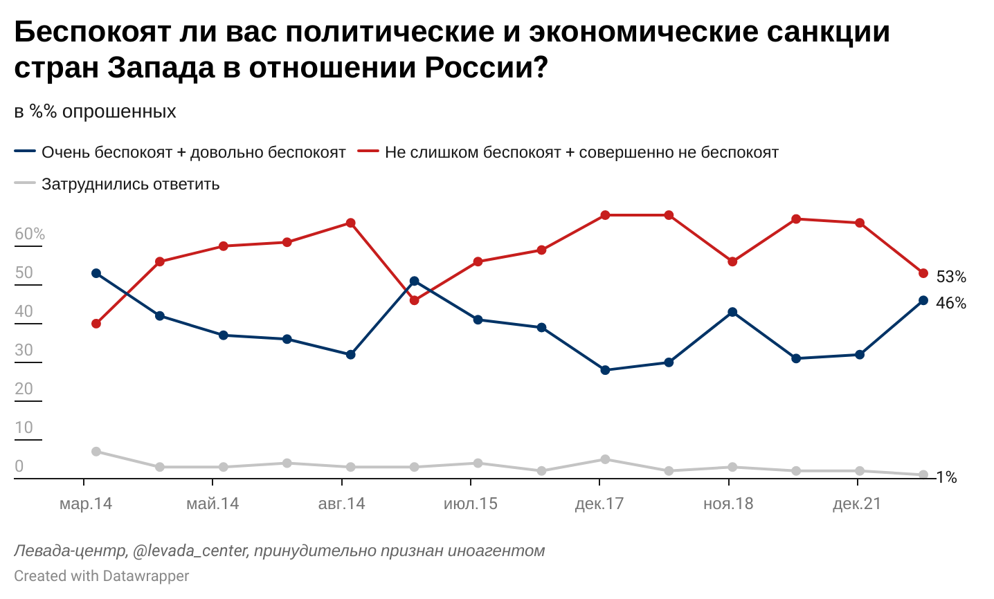 В марте значительно возросла обеспокоенность санкциями Запада в отношении России: они беспокоят почти половину респондентов. Две трети опрошенных считают, что санкции напрямую влияют на широкие слои населения. Около трети отмечают, что санкции уже создали проблемы для них лично и их семьи.