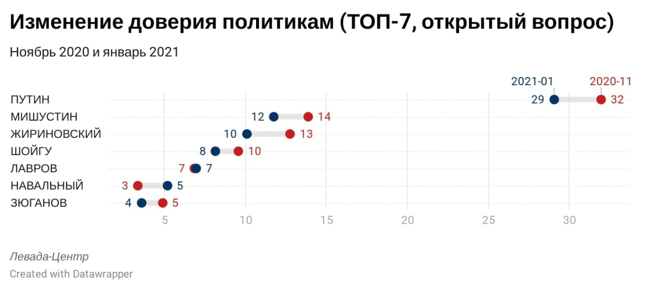 Исследование показало небольшое снижение уровня доверия к главным федеральным политикам, кроме Алексея Навального. При этом кумулятивно доля доверяющих федеральным системным политикам снизилась с 51% до 46%.