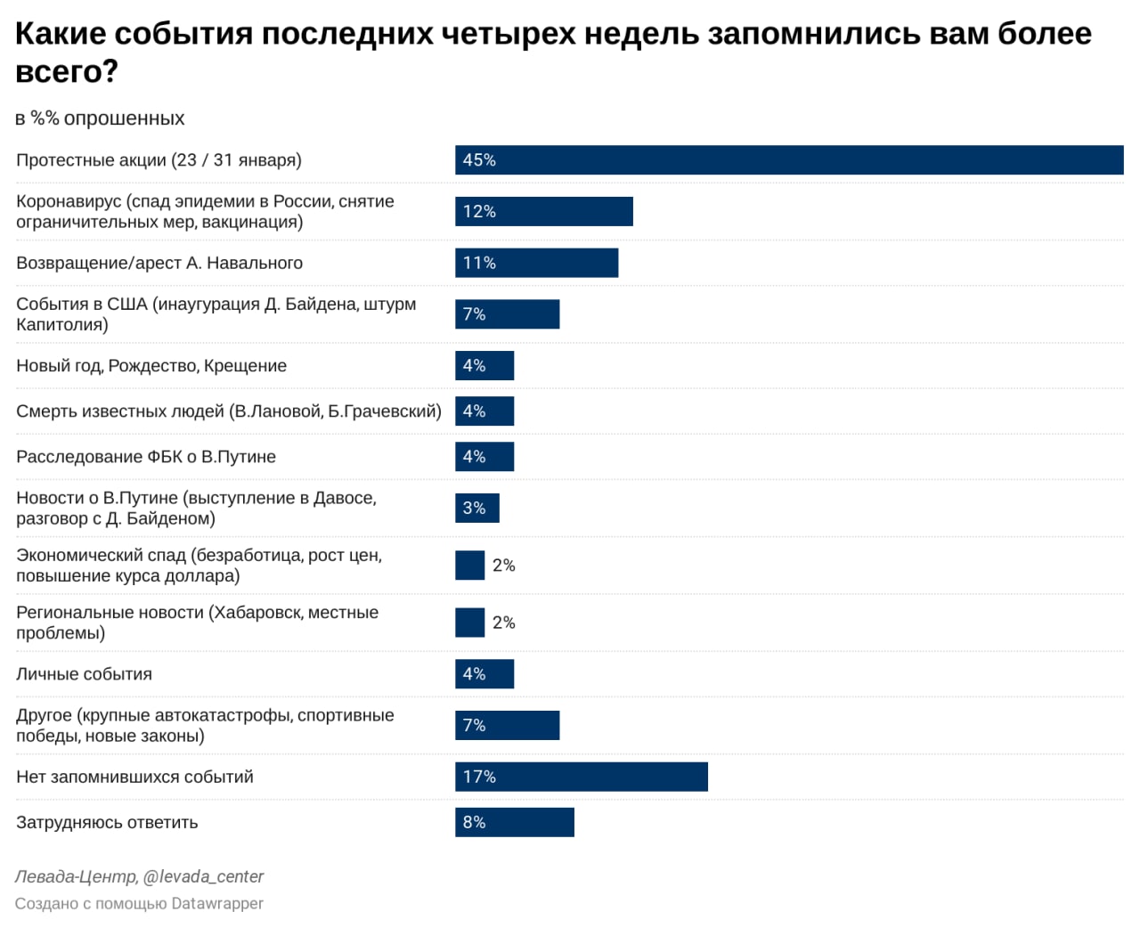 80% россиян знают о недавних протестах, связанных с арестом Алексея Навального. Это самые значительные результаты для протестных акций последних лет. Количество людей, которые ждут новых протестных акций достигло максимальных значений с 1998 года. Однако отношение в обществе к протестующим в этот раз хуже, чем наблюдалось в ходе других акций протеста. При этом снижается доля выразивших готовность принимать участие в протестах.