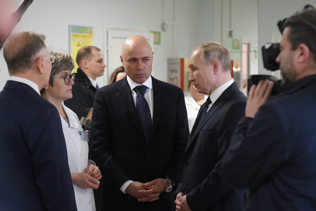 Владимир Путин в сопровождении Игоря Артамонова посетил новую детскую поликлинику в Усмани.