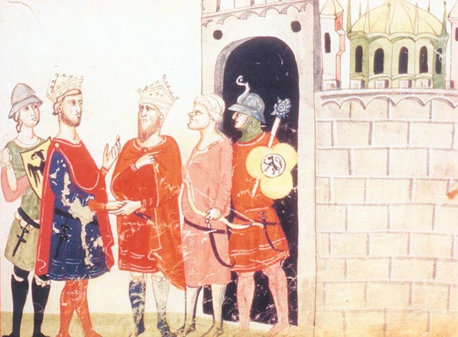 Император Священной Римской империи Фридрих II дал обет принять участие в Крестовом походе, но исполнять его не торопился. В 1227 году он наконец-то отплыл в Святую землю, но серьезно заболел и повернул обратно. За нарушение обета папа римский Григорий IX тут же отлучил его от церкви. И даже через год, когда Фридрих снова сел на корабль, папа не отменил наказание. В это время на Ближнем Востоке шли междоусобные войны, начавшиеся после смерти Саладина. Его племянник аль-Камиль вступил в переговоры с Фридрихом, надеясь, что тот поможет ему в борьбе с братом аль-Муаззамом. Но когда Фридрих наконец поправился и снова отплыл в Святую землю, аль-Муаззам умер — и помощь аль-Камилю была больше не нужна. Тем не менее Фридриху удалось убедить аль-Камиля вернуть христианам Иерусалим. У мусульман оставалась Храмовая гора с исламскими святынями — «Куполом скалы» и мечетью аль-Акса. Этот договор был достигнут отчасти благодаря тому, что Фридрих и аль-Камиль говорили на одном языке — как в буквальном, так и в переносном смысле слова. Фридрих вырос на Сицилии, большая часть населения которой была арабоговорящей, говорил по-арабски сам и интересовался арабской наукой. В переписке с аль-Камилем Фридрих задавал ему вопросы по философии, геометрии и математике. Возвращение Иерусалима христианам путем тайных переговоров с «неверными», а не открытого боя, да и еще отлученным от церкви крестоносцем, многим казалось подозрительным. Когда Фридрих из Иерусалима приехал в Акру, его закидали потрохами.