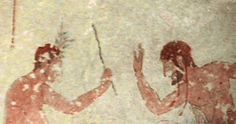 Оба мужчины подняли руки. У одного из них прут, который он готов опустить, и это радует обоих мужчин. Картина довольно затёртая, но смысл происходящего очевиден – понятно, что художник пытался изобразить некоторые необычные развлечения, бывшие в ходу много тысячелетий назад.