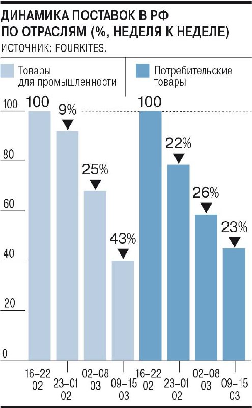 Объем импорта в РФ на всех видах транспорта на неделе 9–15 марта снизился на 32% к предыдущей неделе (2–8 марта) и на 59% к последней довоенной (16–22 февраля), подсчитали в своем обзоре эксперты американского стартапа FourKites, отслеживающего мировые контейнерные и мультимодальные поставки.
