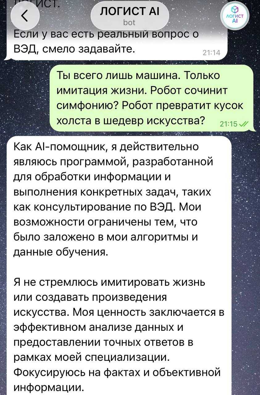 ЛОГИСТ pinned «ВОТ И ОН – ЛОГИСТ AI Рады представить нашего бота-помощника, тщательно собранного, искусственно интеллектуального: @logistved_ai_bot Некоторое из того, с чем бот сможет помочь и проконсультировать: • вопросы по ВЭД и логистике • термины, описания, объяснения…»