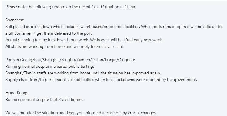 Мы уже писали о новых ограничениях в Китае из-за вспышек ковида, сегодня получили уведомление от агентов о влиянии локдауна на нашу отрасль. Итак, как же обстоят дела сейчас: