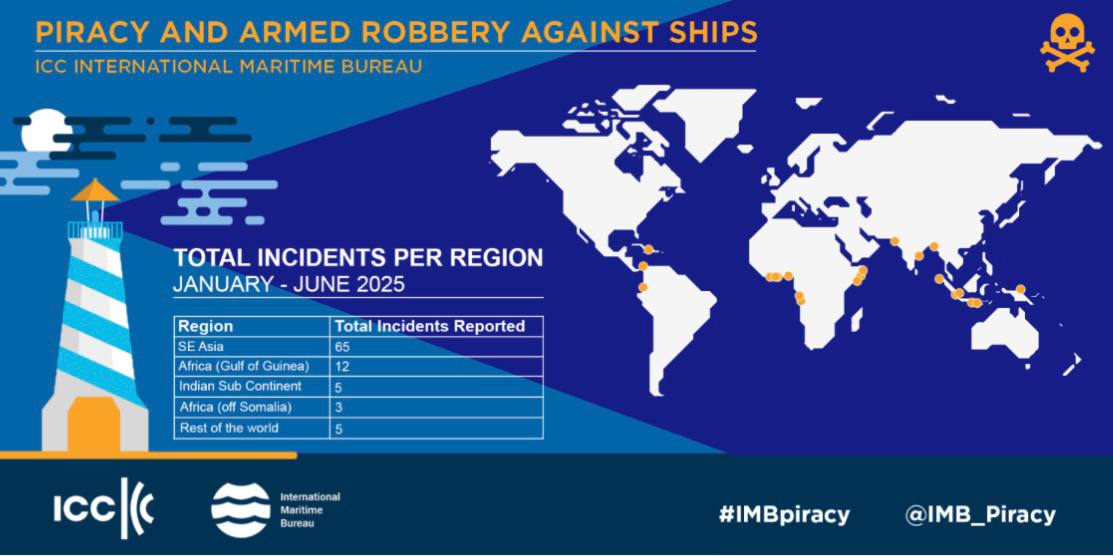 За первое полугодие 2025 года Международное морское бюро (IMB) зафиксировало наивысшее за последние пять лет количество инцидентов, связанных с пиратством и вооруженными нападениями на суда