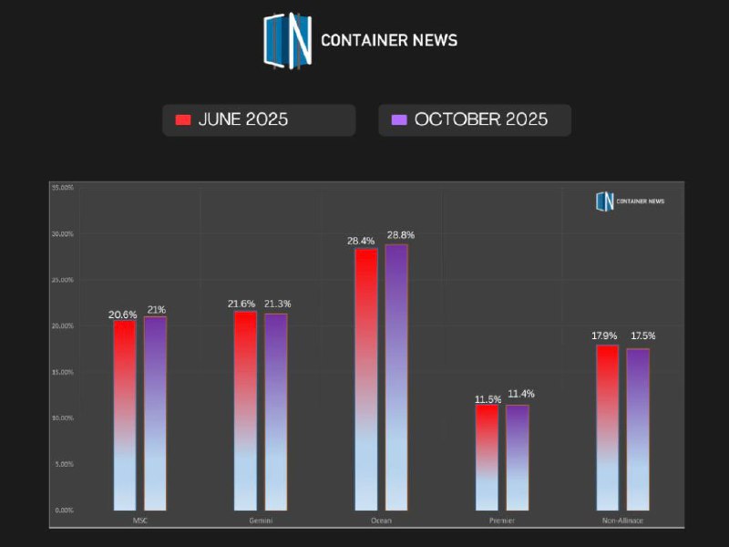 Совместный портфель заказов – 86 судов: 51 у ONE, 17 у HMM и 18 у Yang Ming. Хотя доля немного снизилась с 11,5% четырьмя месяцами ранее, альянс сохраняет хорошие позиции для конкуренции на высокообъемных региональных и дальнемагистральных коридора