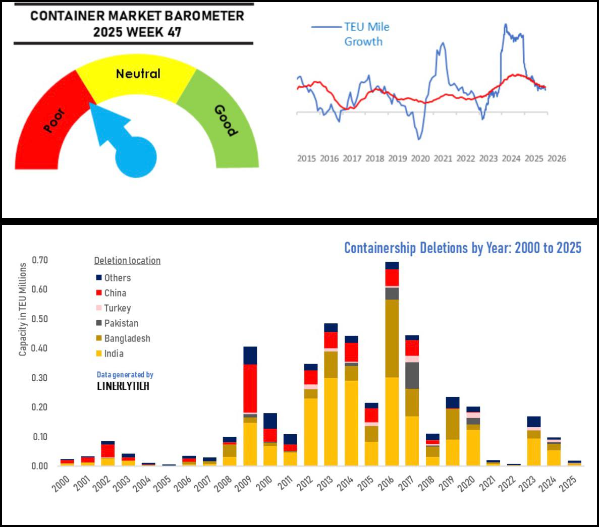С начала года на лом отправлено всего 14 контейнеровозов общим объемом 9 857 TEU, и новых продаж на утилизацию в декабре не ожидается — высокие доходы на чартерном рынке делают дальнейшее списание судов экономически нецелесообразным
