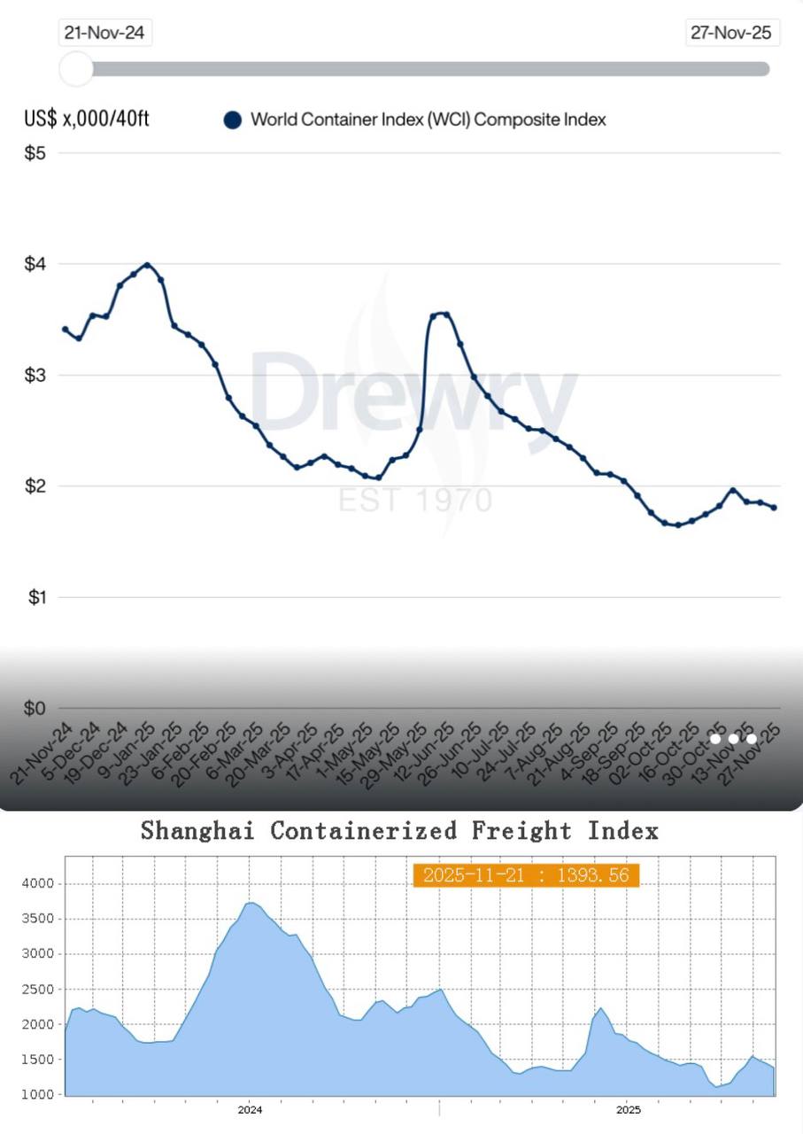 • Шанхайский индекс контейнерных перевозок (SCFI) также падает – сократился на 10,1% с прошлых данных