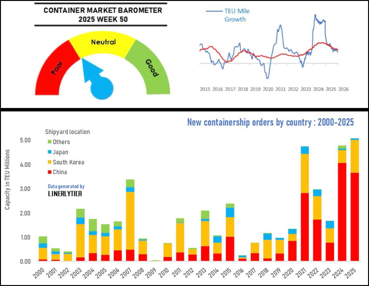 По данным Linerlytica, в 2025 году объем заказов на контейнеровозы достиг рекордных 5,08 млн TEU, из них 72% пришлись на Китай – абсолютный исторический максимум