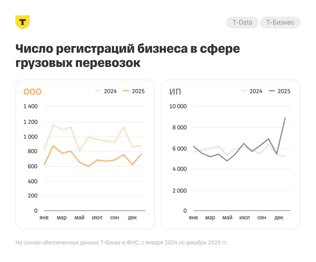 В Т-Бизнесе провели исследование динамики регистрации бизнеса в сфере грузоперевозок в 2025 году: