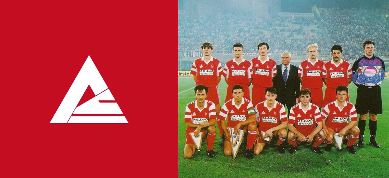 Впервые такой треугольник на футболках «Локо» появился ещё в 1988 году (респект парням из заглохшего проекта mzdbrand, которые пошагово проследили историю лого), с ним кЛуб в 1992 году стартовал в первом чемпионате России после развала СССР. А в 1993-м эмблема была доведена до идеала лаконичности и геометричности. И именно она красовалась на груди футболистов «Локомотива» 15 сентября 1993 года, когда состоялся долгожданный дебют кЛуба в еврокубках.