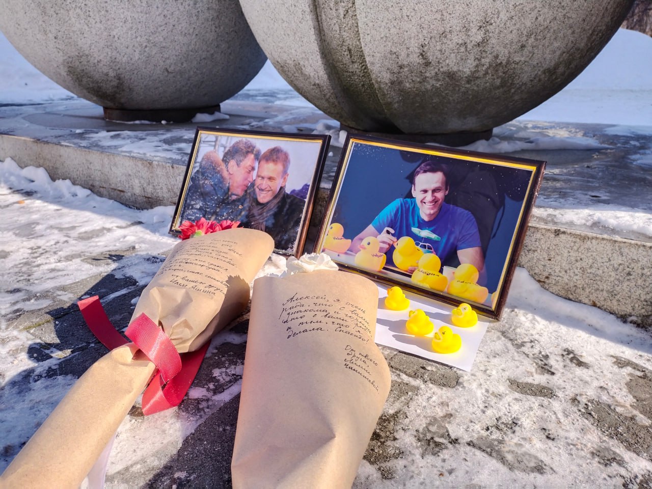 Стихийный мемориал в память об убитых путинским государством политиках Алексее Навальном и его друге Борисе Немцове появился у памятника «три шурупа» в Уфе возле медицинского университета.