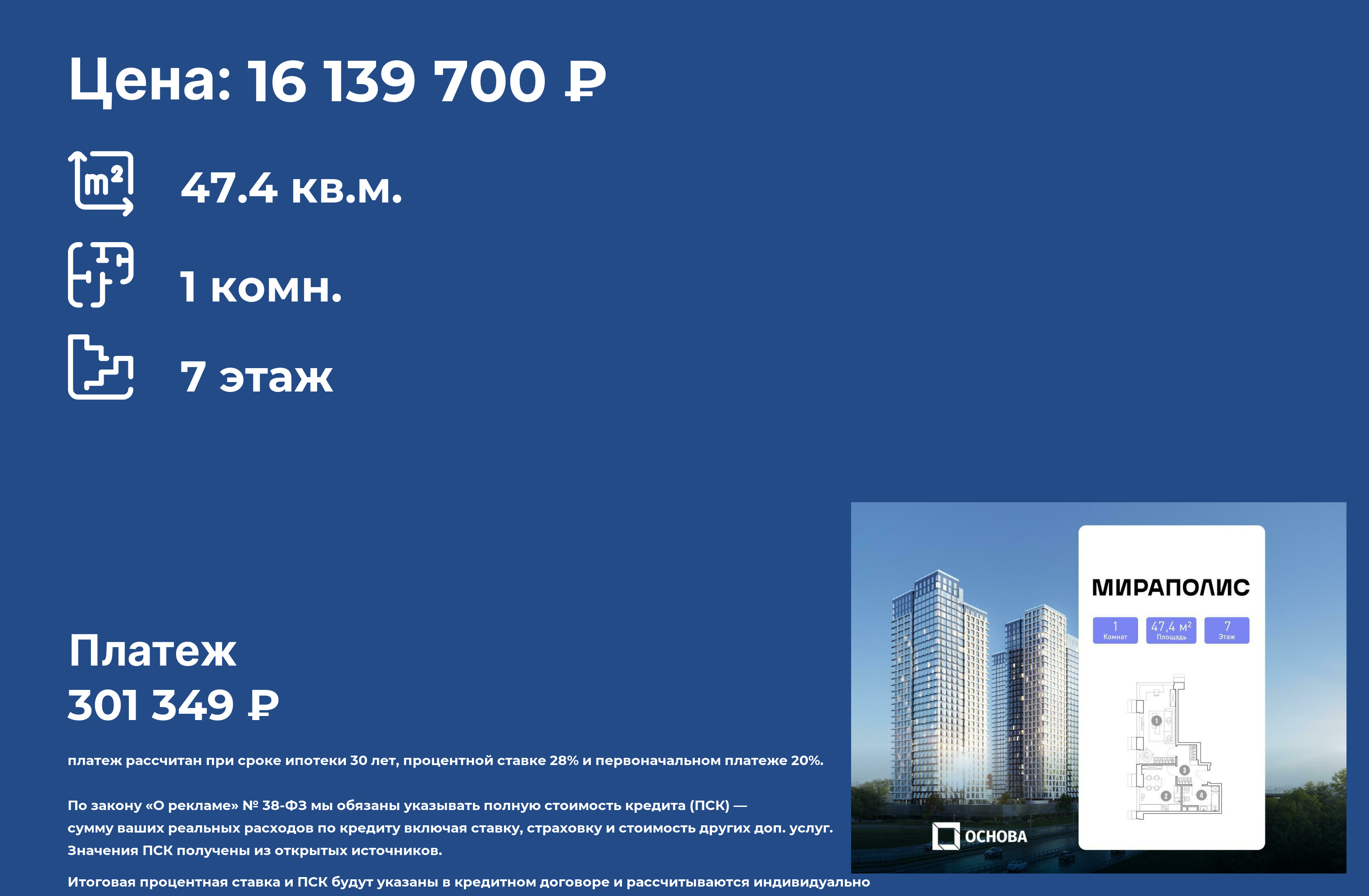 ℹПродаются 1-к апартаменты площадью 47.4 кв.м. на 7-м этаже 33 этажного дома в ЖК "Мираполис" от ГК ОСНОВА.