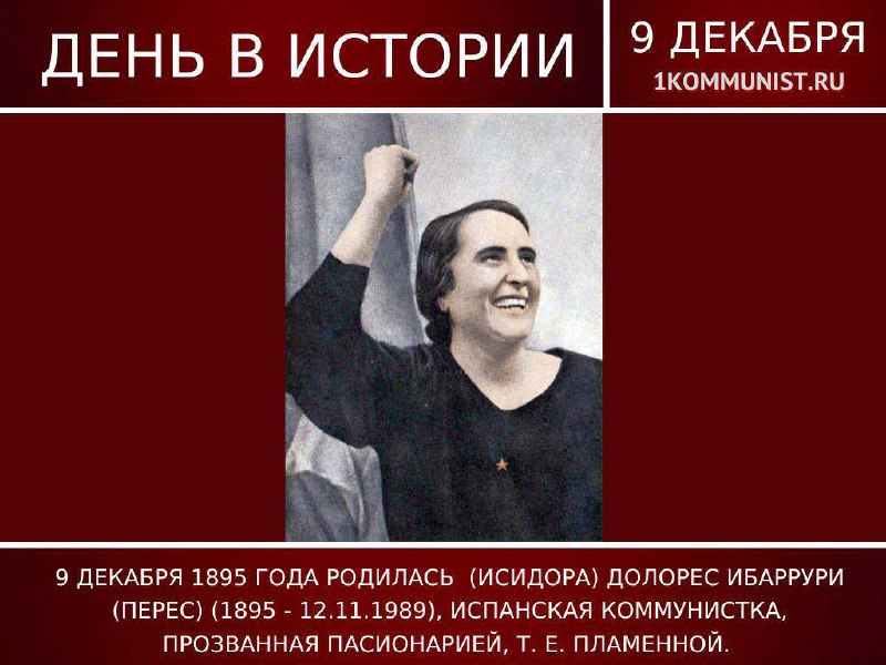 9 декабря 1895 года родилась Долорес Ибаррури Гомец (исп. Dolores Ibárruri Gómez, 9 декабря 1895 - 12 ноября 1989) - деятельница испанского и международного коммунистического движения, активная участница республиканского движения в годы Гражданской войны 1936 - 1939 годов в Испании и одна из основательниц Международной демократической федерации женщин, затем деятель эмигрантской оппозиции диктатуре Франко.