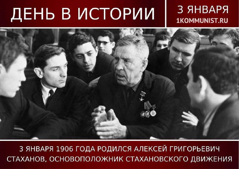 3 января 1906 года родился Алексе́й Григо́рьевич Стаха́нов (21 декабря 1905 3 января 1906 год - 5 ноября 1977) - советский шахтёр, новатор угольной промышленности, основоположник Стахановского движения, Герой Социалистического Труда (1970).