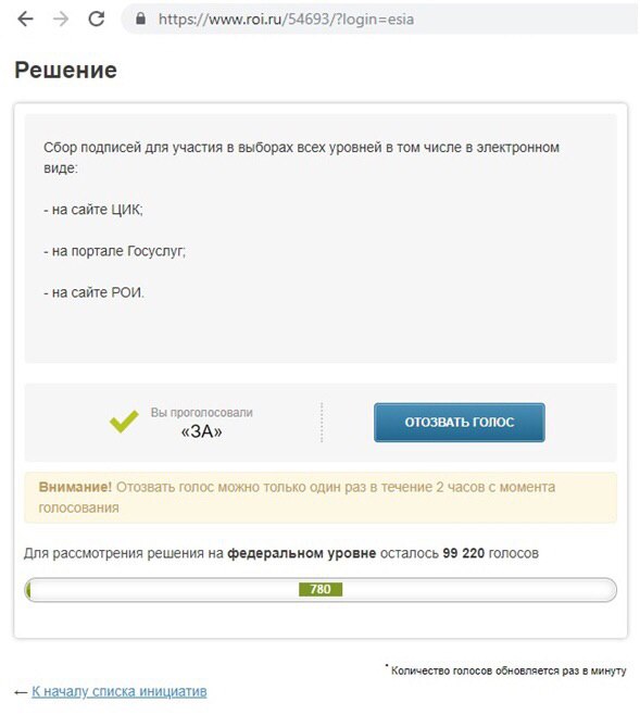 Однако мы уверены, что активность избирателей при голосовании за инициативу на сайте «Российской общественной инициативы» продемонстрирует поддержку идеи и наличие достаточного количества избирателей, которые в состоянии воспользоваться возможностью поставить свою электронную подпись.