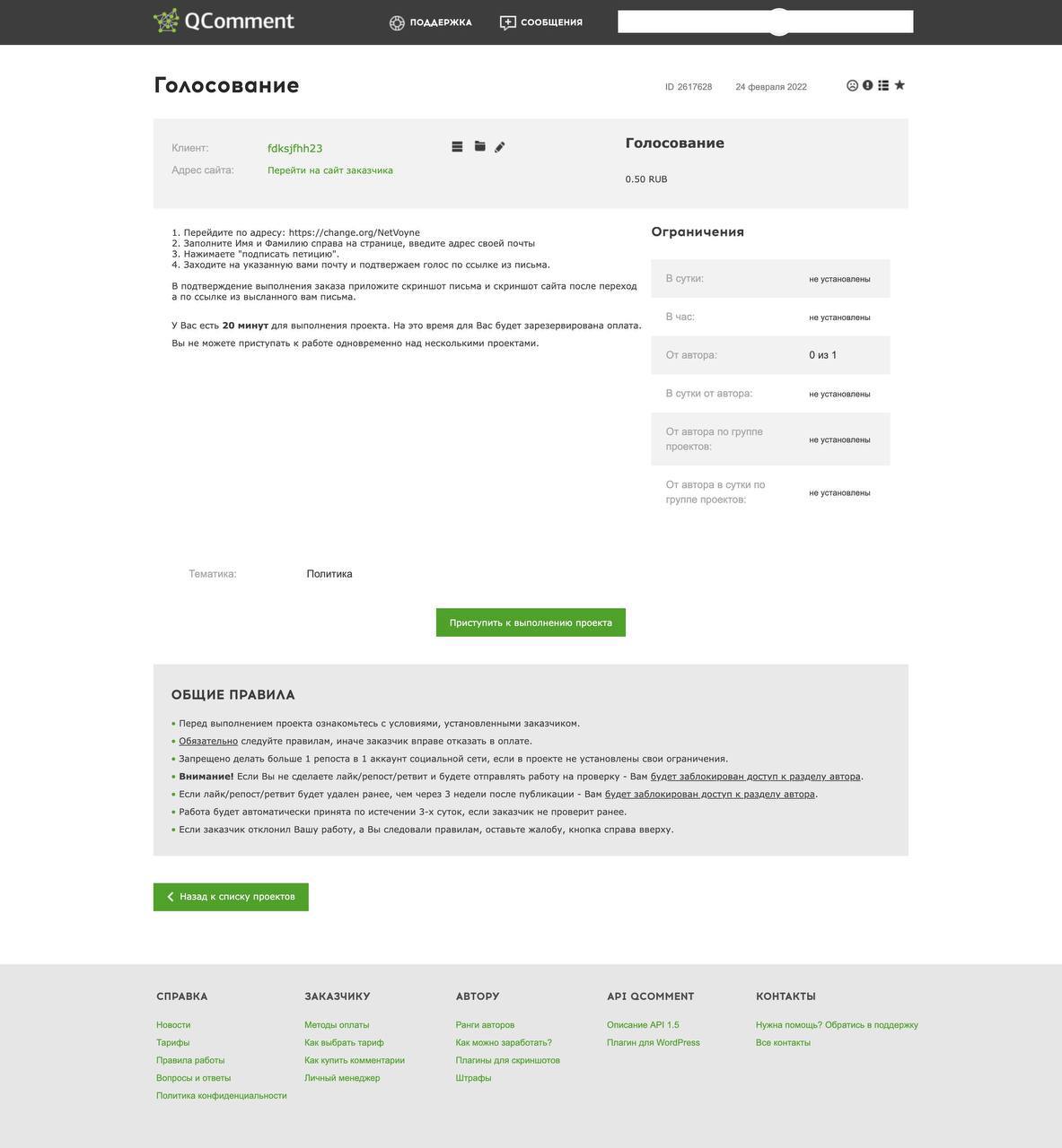 Стоимость одного голоса под петицией – 0,50 рублей. В тексте заказа подробно прописан алгоритм действий: зайти на сайт с петицией, заполнить поля для имени и фамилии, указать адрес почты, нажать на кнопку «подписать», перейти на почту и подтвердить голос по ссылке из письма. Для получения оплаты предлагают прислать скриншот сайта и письма. На выполнение задания дается 20 минут.