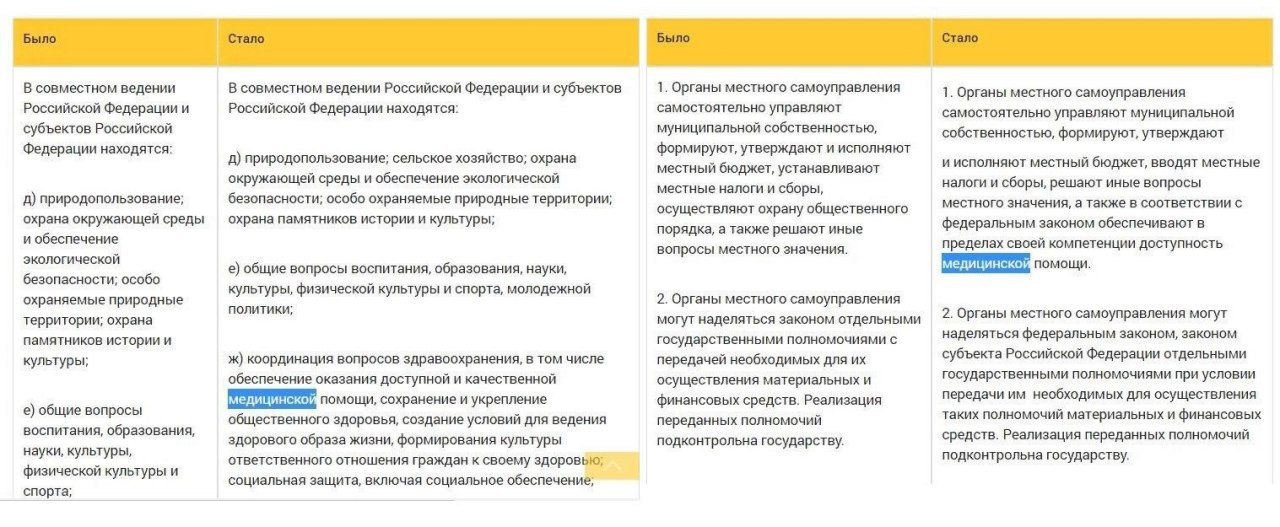 Напомним, в проекте поправок в Конституцию РФ меняется статья 72, регулирующая совместную ответственность федеральной и региональных властей по части здравоохранения, а также статья 132 ч 1, уточняя компетенцию органов местного самоуправления в организации здравоохранения.