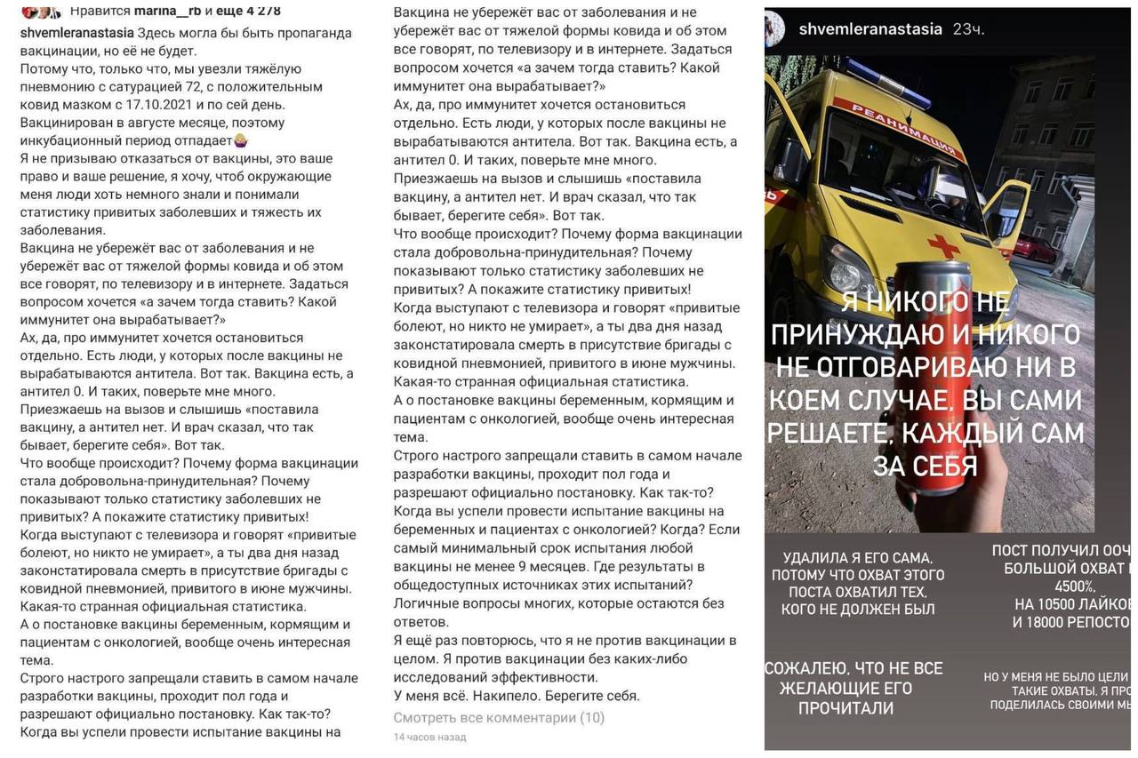 Общественный резонанс вызвал пост фельдшера скорой помощи новосибирской клинической центральной районной больницы Анастасии Швемлер, в котором она поставила под сомнение эффективность вакцинации против коронавируса.