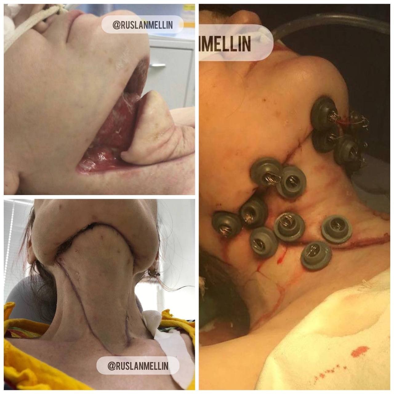 У пациентки развилась флегмона. В течение двух недель она находилась в отделении реанимации и перенесла четыре операции под общим наркозом. Период восстановления прошел хорошо. Сейчас у женщины остались только рубцы на шее.