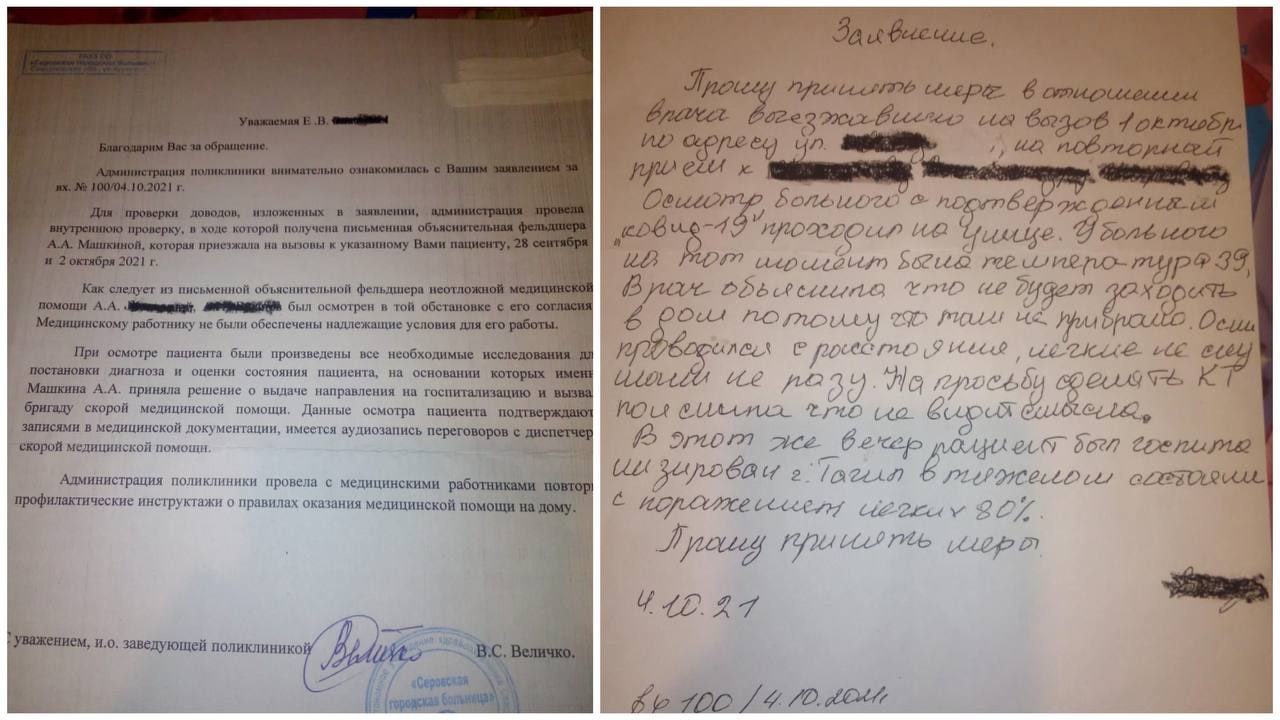 Женщина добавила, что в этот же вечер её папу госпитализировали с 80% поражением легких, а 27 октября он скончался. Дочь написала жалобу на имя главного врача серовской городской больницы.