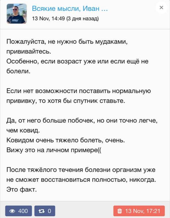 При этом он предлагает прививаться «нормальной» вакциной, а если нет такой возможности, то тогда «хотя бы российским Спутником».