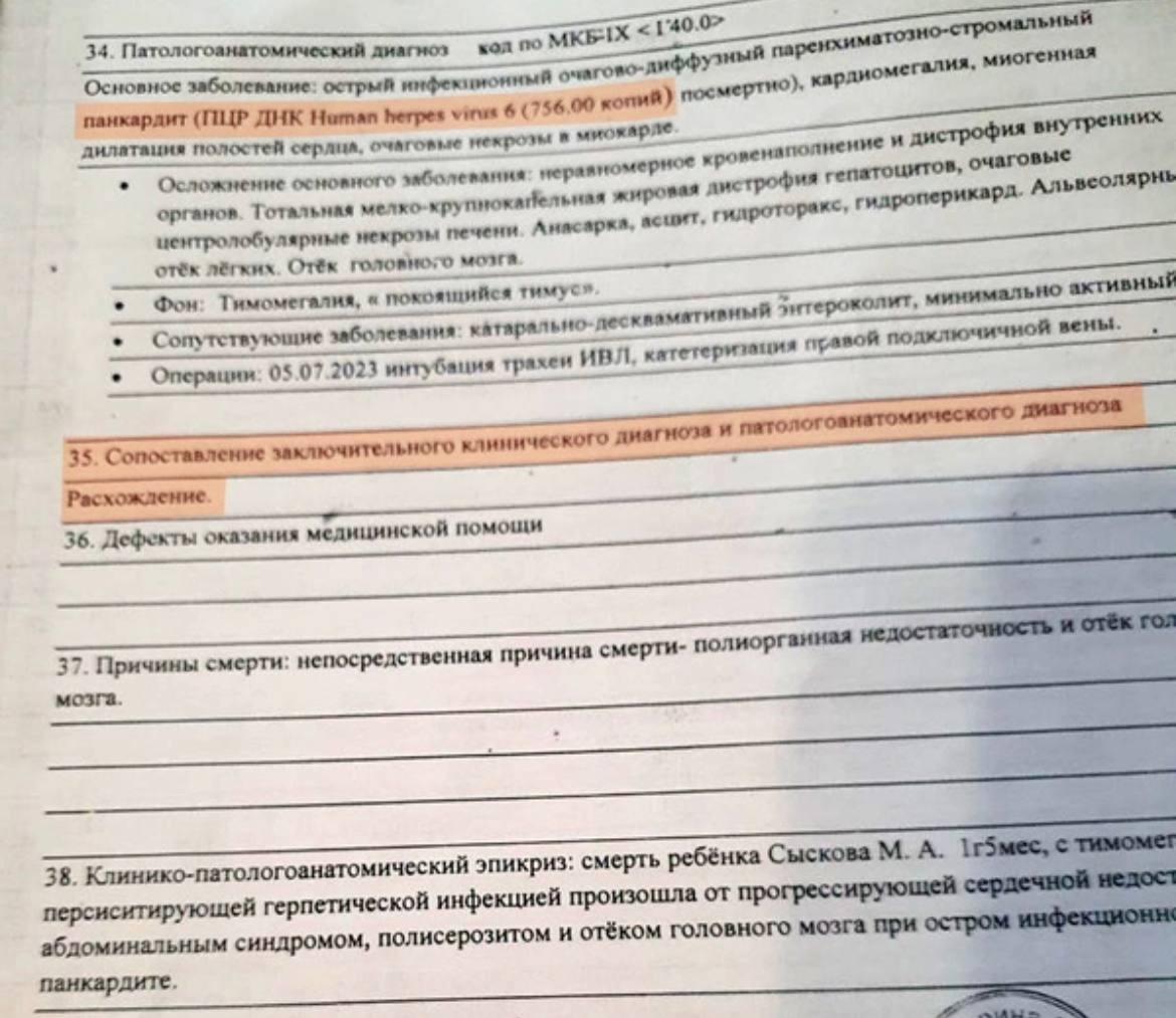 Вскрытие установило диагноз: инфекционный панкардит, возбудителем которого стал вирус герпеса. Энтероколит указан как сопутствующее заболевание.