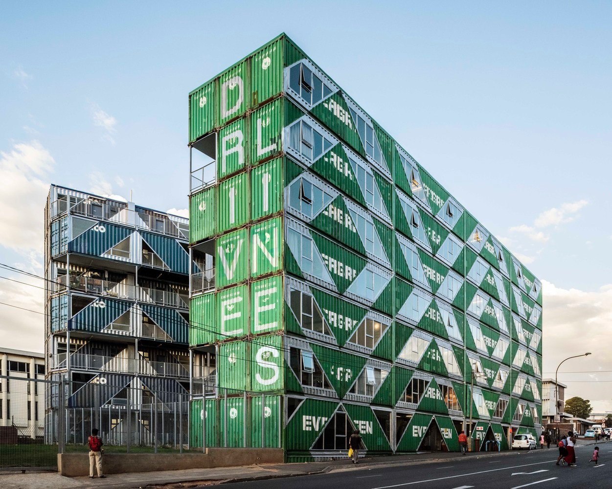 В южноафриканском Йоханнесбурге есть дом нового поколения — многоэтажка из 140 грузовых контейнеров. Звучит тупо, но выглядит концептуально. Контейнеры соединяют лестницы и переходы, в их стенках прорезаны стильные косые окна, формирующие на фасаде рисунок. На первом этаже помимо квартир имеются магазины и дворик с садом и бассейном.