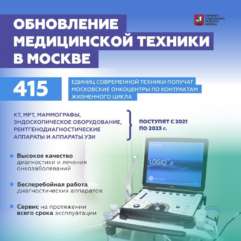 «В Москве продолжается внедрение нового стандарта онкологической помощи, в соответствии с которым внутри каждого округа столицы формируется новая эффективная система связи стационарного и амбулаторного звеньев для диагностики и лечения пациентов. Для оснащения многопрофильных онкологических центров и центров амбулаторной онкопомощи мы закупили 415 единиц медтехники по контрактам жизненного цикла. Установка самого современного оборудования позволит повысить качество диагностики и лечения онкозаболеваний, а уникальная технология закупок гарантирует бесперебойную работу диагностических аппаратов, потому что производитель обеспечивает сервис на весь срок эксплуатации», — рассказала она.